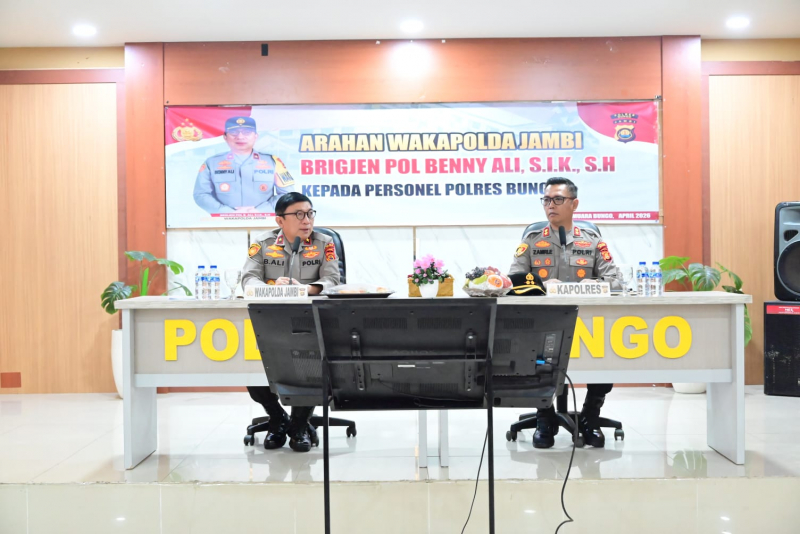 JAMBI, Bungopos.com – Wakapolda Jambi Brigjen Pol. Benny Ali melaksanakan kegiatan tatap muka dan memberikan arahan kepada jajaran Polres di wilayah Polda Jambi, yakni Polres Tebo, Polres Bungo, dan Polres Merangin, pada Senin (13/4/2026).