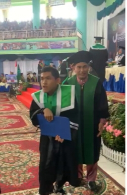 Pada prosesi hari pertama Wisuda Sarjana ke-70, Magister ke-43, dan Doktor ke-19 dalam rangka Dies Natalis ke-58 UIN Sulthan Thaha Saifuddin Jambi Tahun 2025, wajah Dimas terlihat sangat bahagia. Ia tampak sumringah saat menerima pemindahan kuncir sebagai simbol kelulusan, di tengah suasana yang penuh kehangatan dan kebanggaan. Tahun ini, UIN STS Jambi mengusung tema “Creating a Generation of Moderate Entrepreneurs,” yang selaras dengan semangat kemandirian dan moderasi yang terus digaungkan kampus.