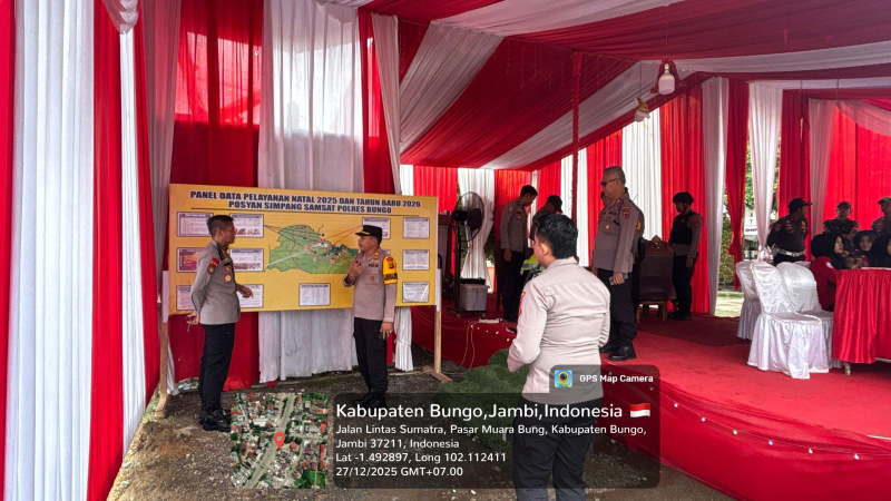 Bungo,Bungopos.com – Direktorat Samapta Polda Jambi melakukan peninjauan langsung ke Pos Pelayanan (Posyan) Simpang PU dalam rangka memastikan kesiapan pelaksanaan Operasi Lilin Natal dan Tahun Baru (Nataru) 2025, Sabtu (27/12/25).