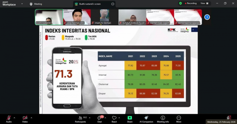 JAKARTA, Bungopos.com - Hasil Survei Penilaian Integritas (SPI) untuk Kementerian Agraria dan Tata Ruang/Badan Pertanahan Nasional (ATR/BPN) Tahun 2025 telah dirilis oleh Komisi Pemberantasan Korupsi (KPK). Indeks Integritas Nasional ATR/BPN secara agregat berada di angka 71,3. Tenaga Ahli Menteri Bidang Ekonomi Pertanahan, Dedi Noor Cahyanto, meminta jajaran, khususnya Kepala Kantor Wilayah (Kakanwil) BPN dan Kepala Kantor Pertanahan (Kakantah) menempatkan perhatian serius atas angka tersebut agar bisa bertahap ditingkatkan secara signifikan.